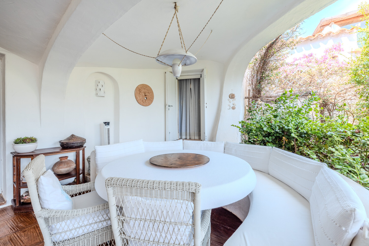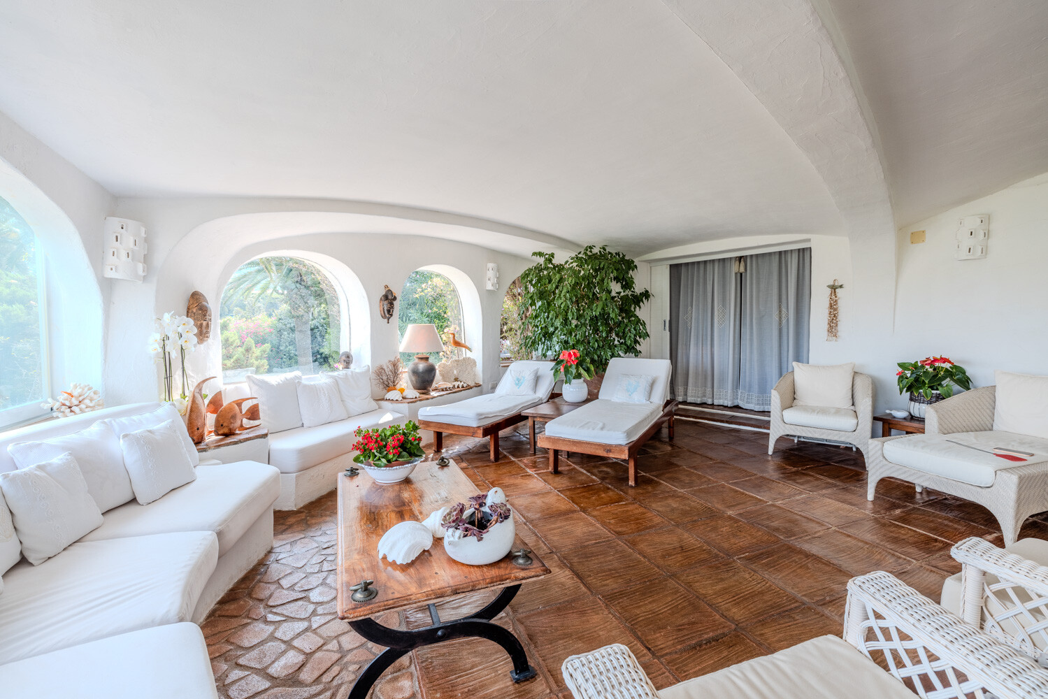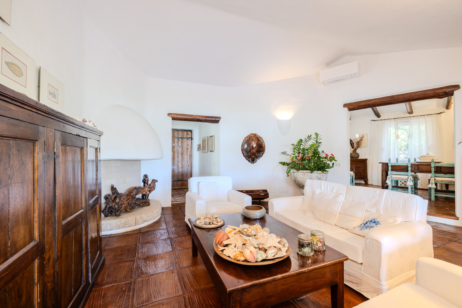 The bright and welcoming interiors open up to the garden through large windows that dissolve the boundaries between inside and outside. The spacious living area is divided into an elegant open space with living room, dining area and open kitchen, all with direct access to the main veranda and outdoor areas. Carved arches and natural materials contribute to a warm and sophisticated atmosphere.