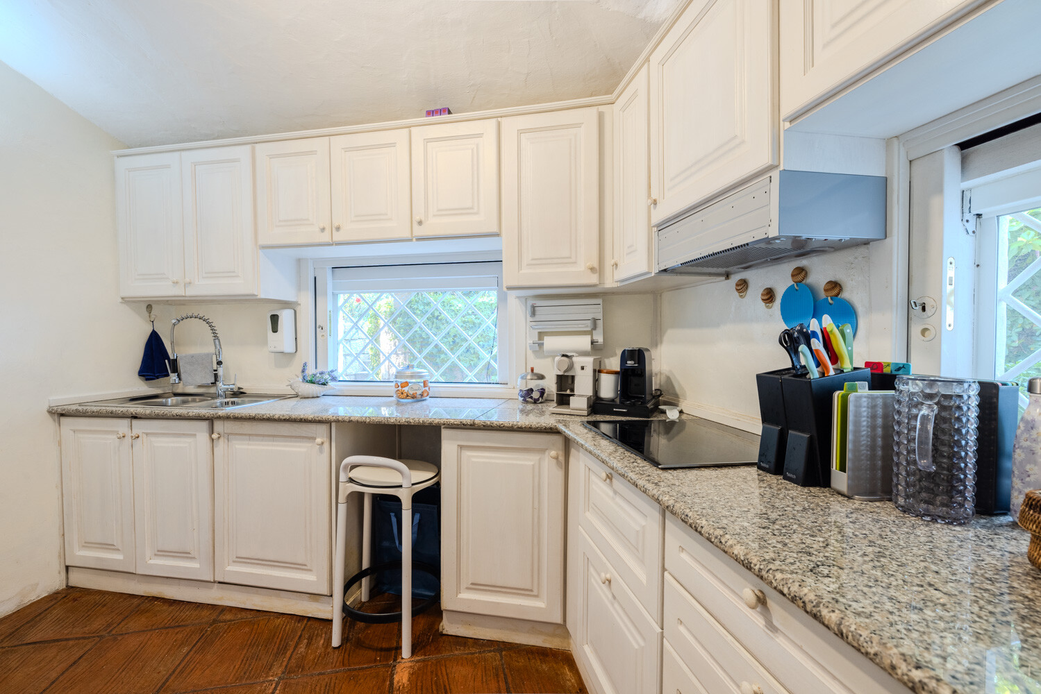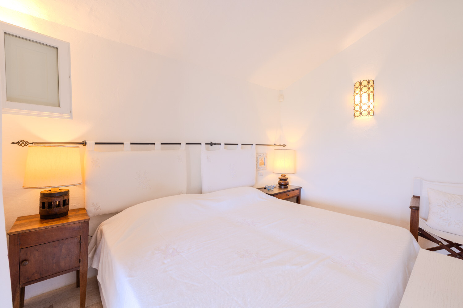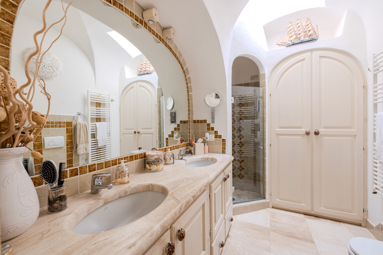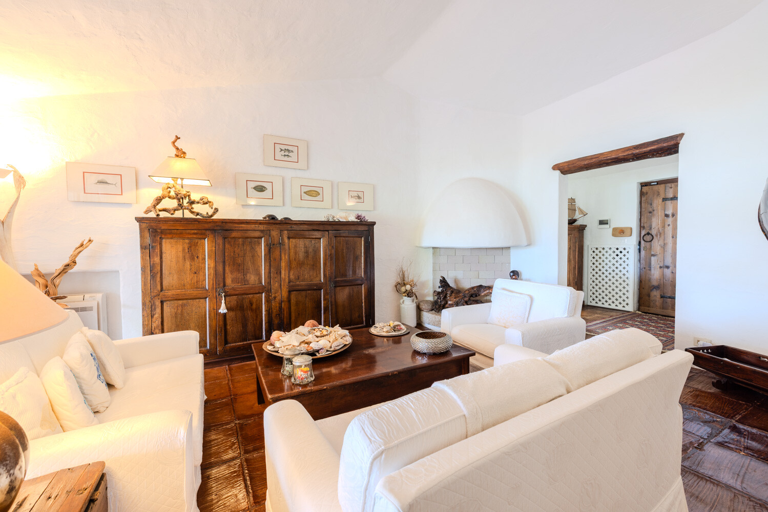 The bright and welcoming interiors open up to the garden through large windows that dissolve the boundaries between inside and outside. The spacious living area is divided into an elegant open space with living room, dining area and open kitchen, all with direct access to the main veranda and outdoor areas. Carved arches and natural materials contribute to a warm and sophisticated atmosphere.