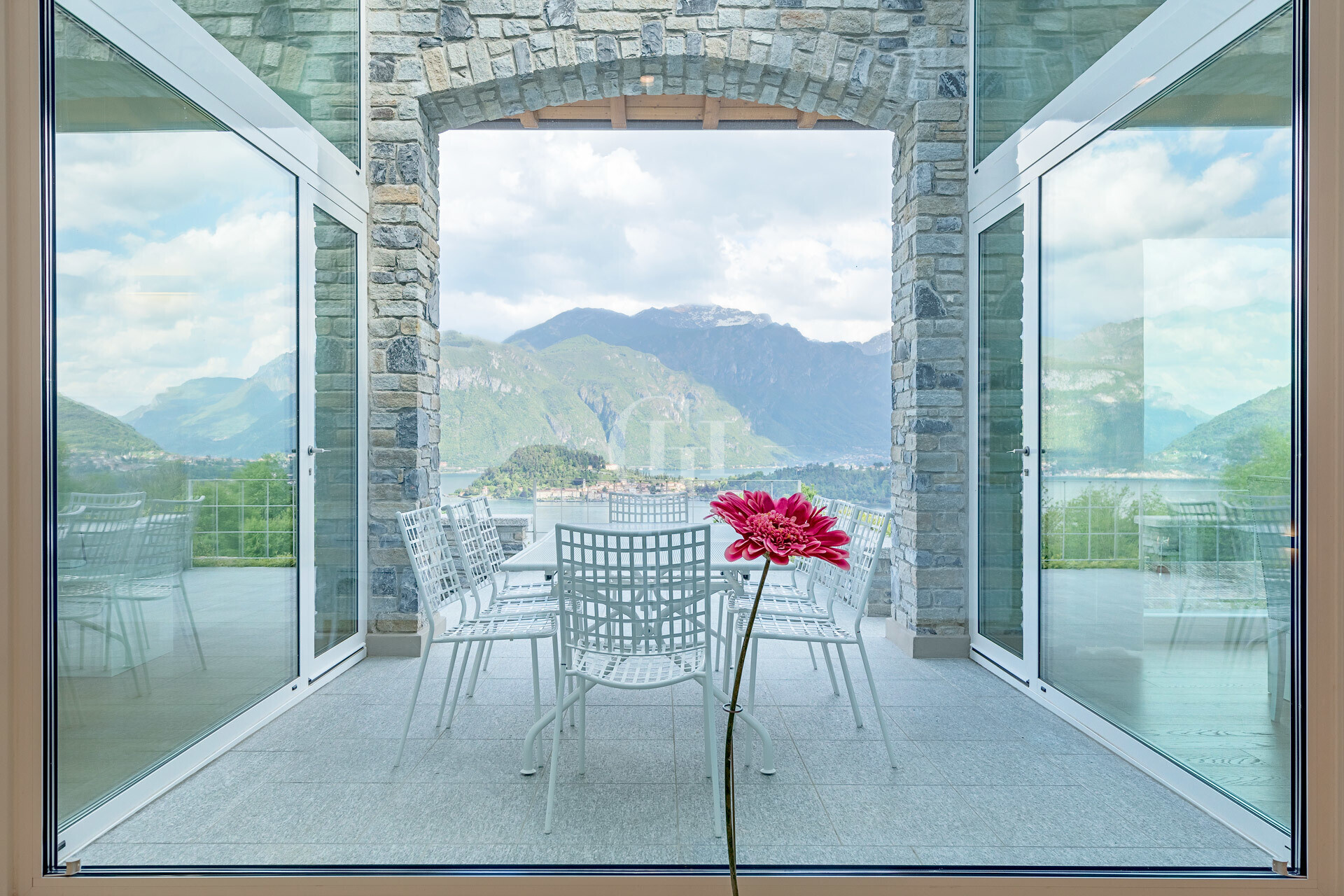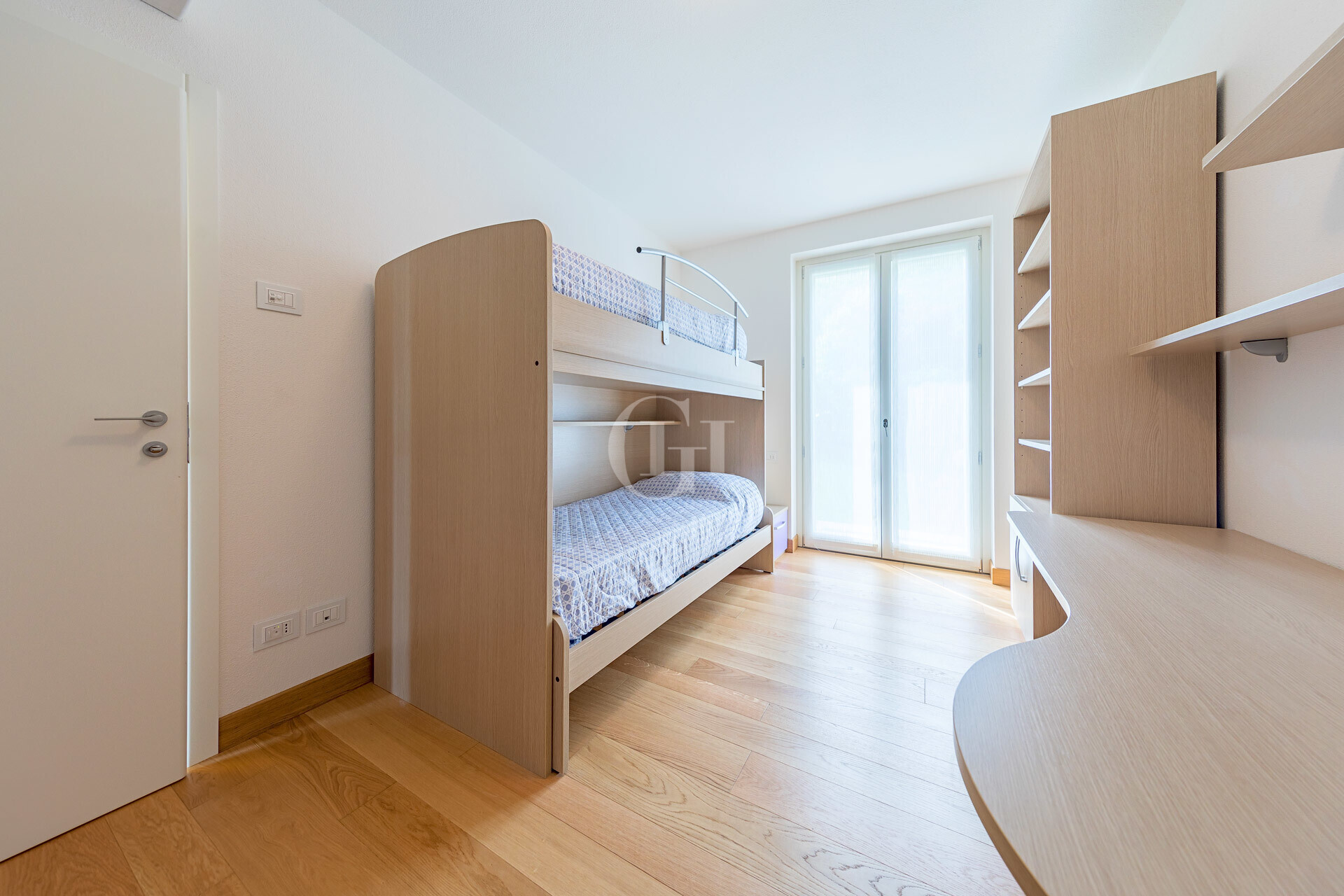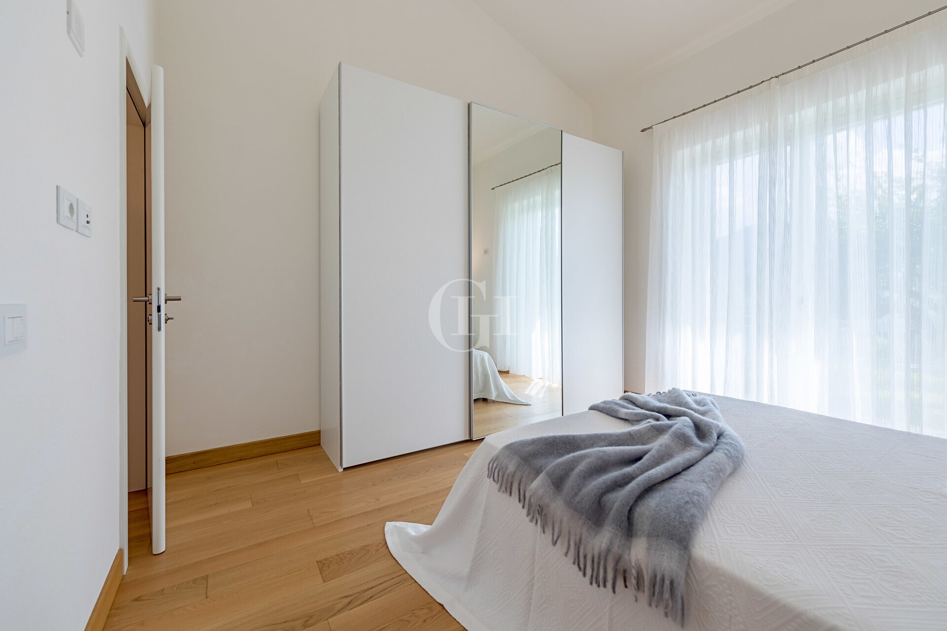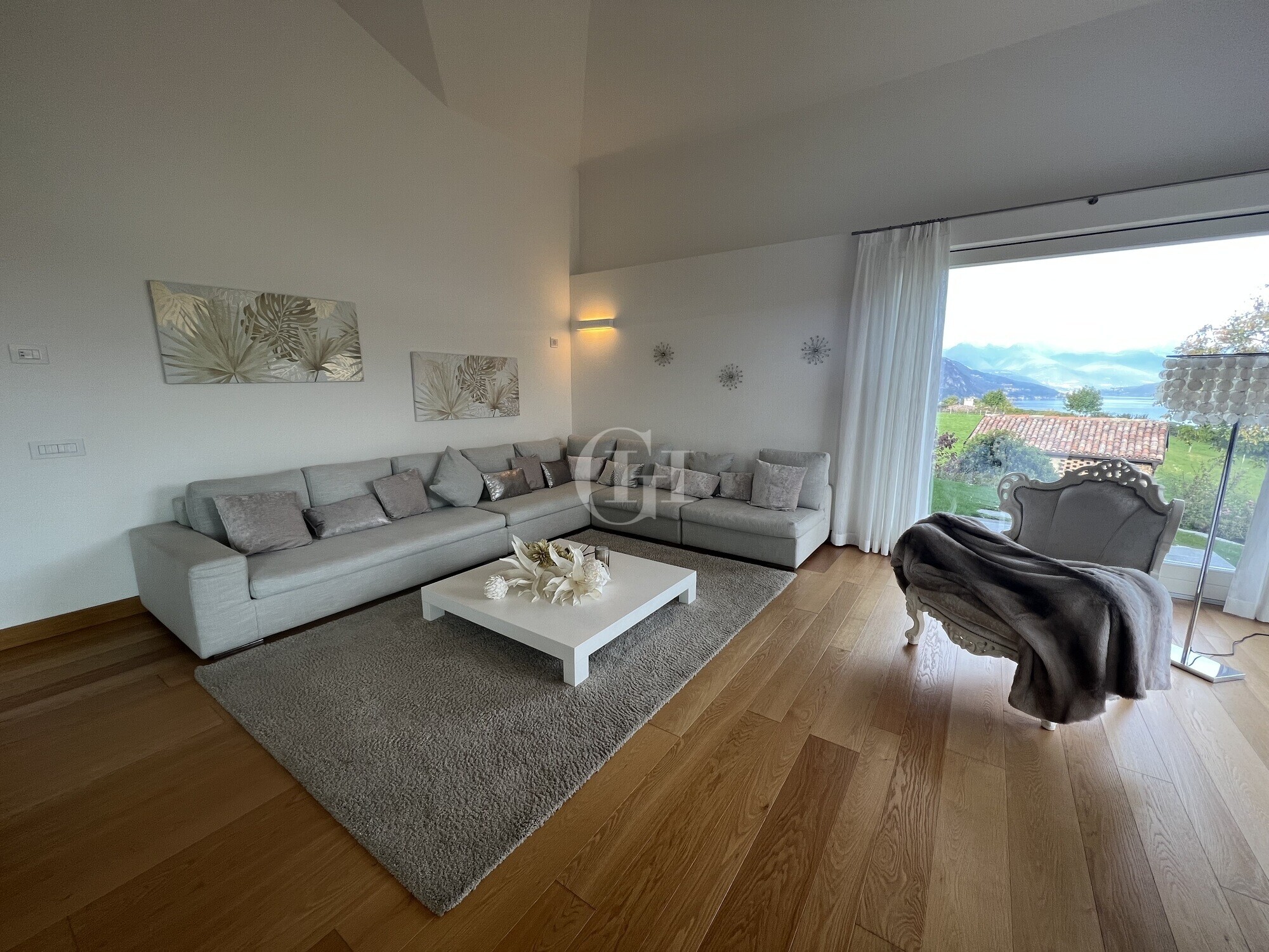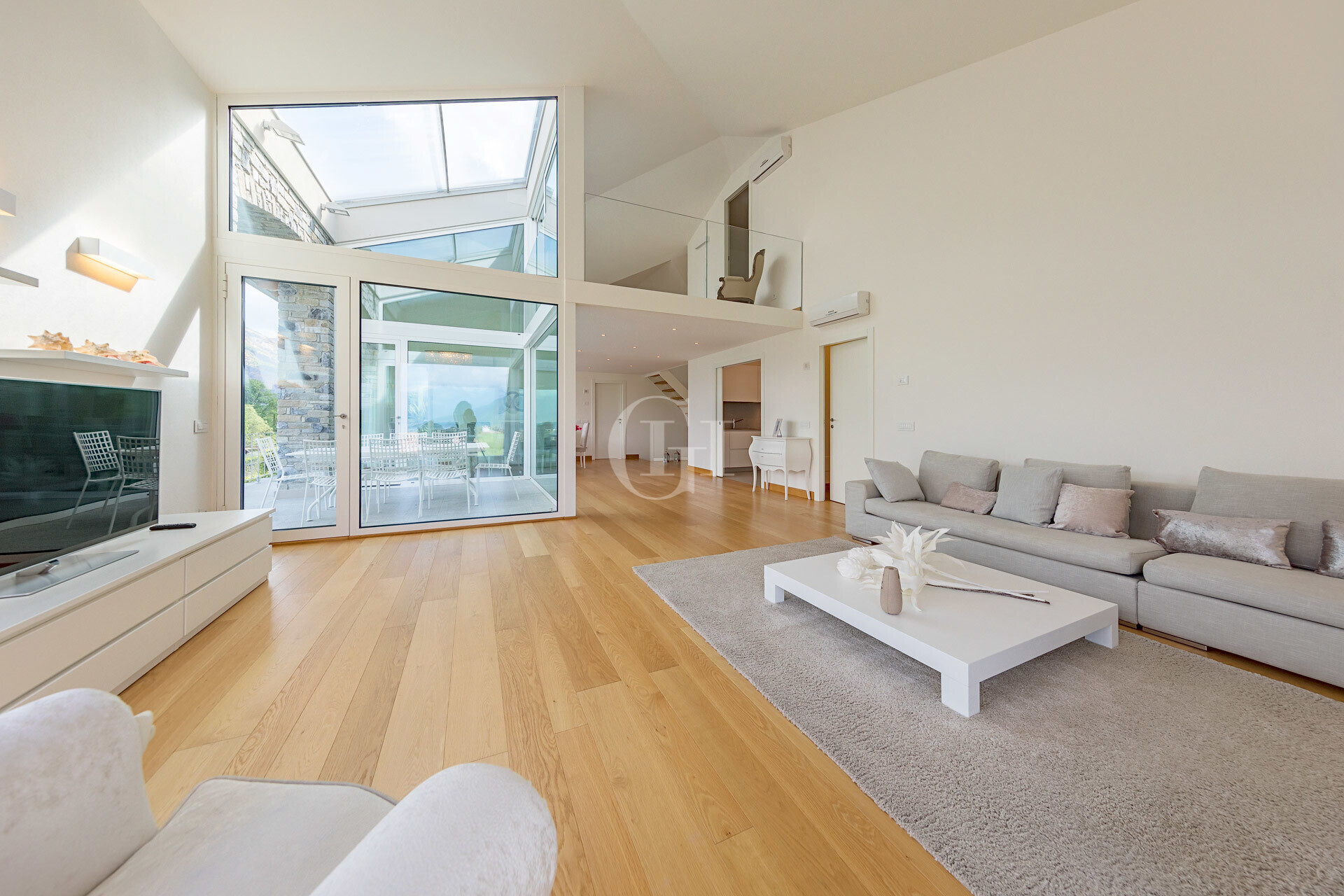 The property is characterized by exceedingly bright rooms: the orientation of the villa and the immense full-wall windows with which the dwelling has been almost entirely designed guarantee perfect natural lighting throughout the day; from the loft, in particular, there is a thrilling view of the lake and the Alps, whose majestic profile begins to silhouette beyond the lake to the north.