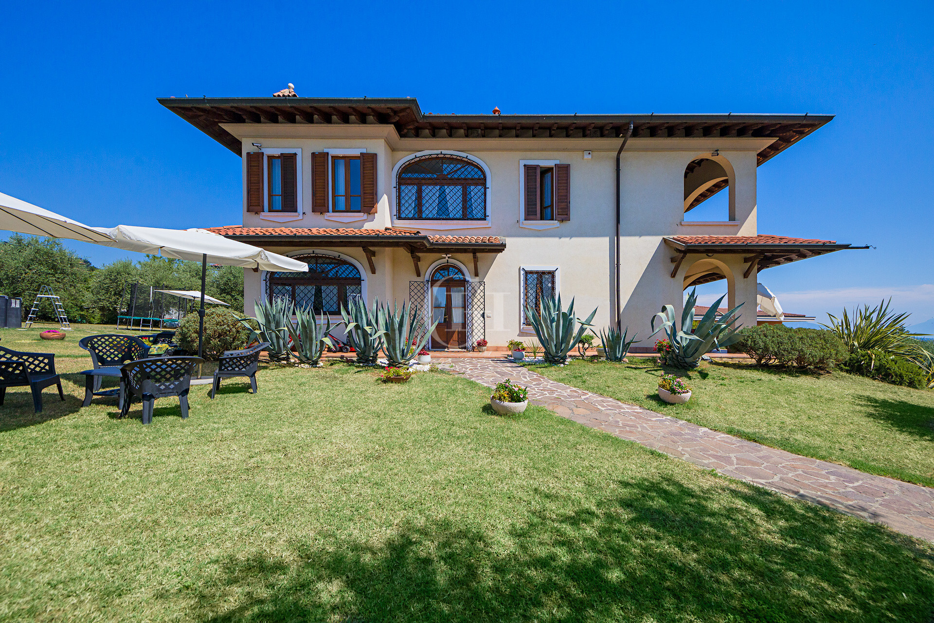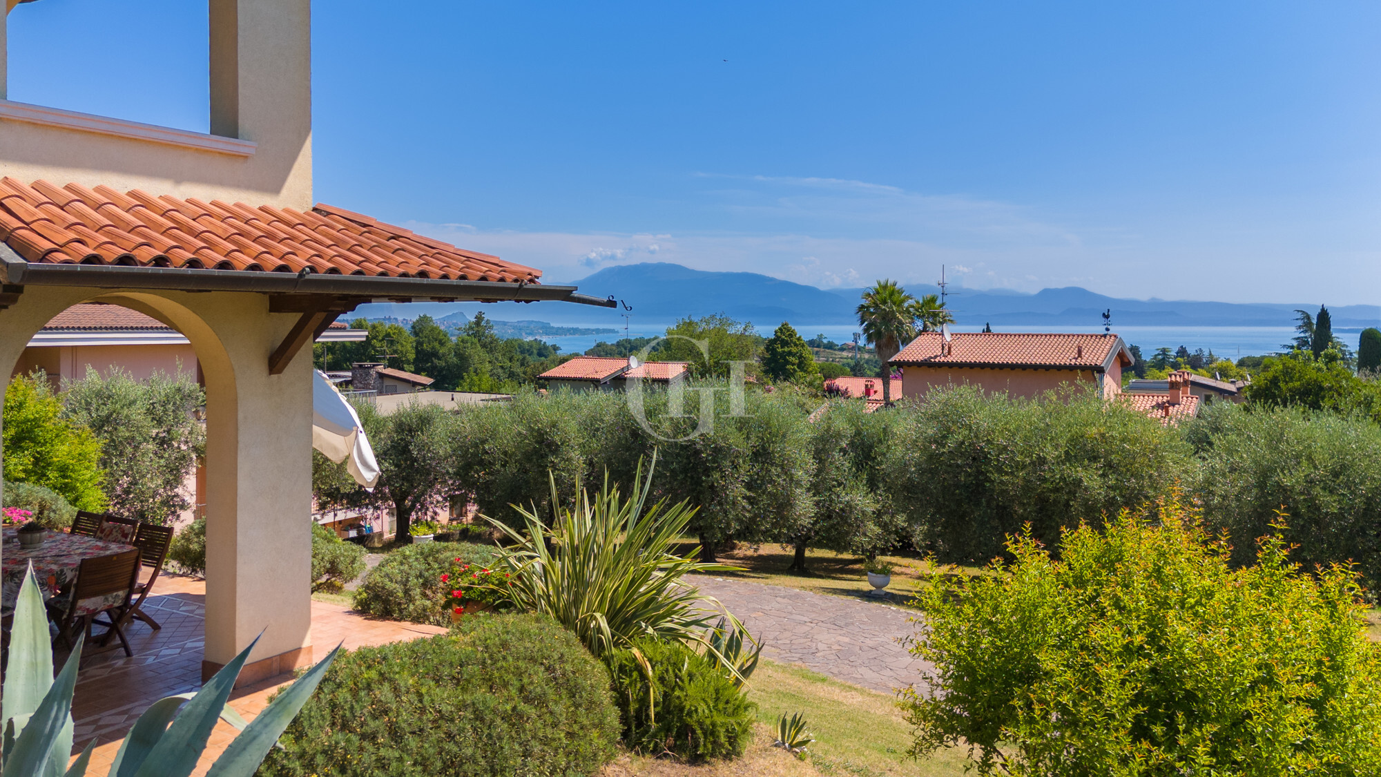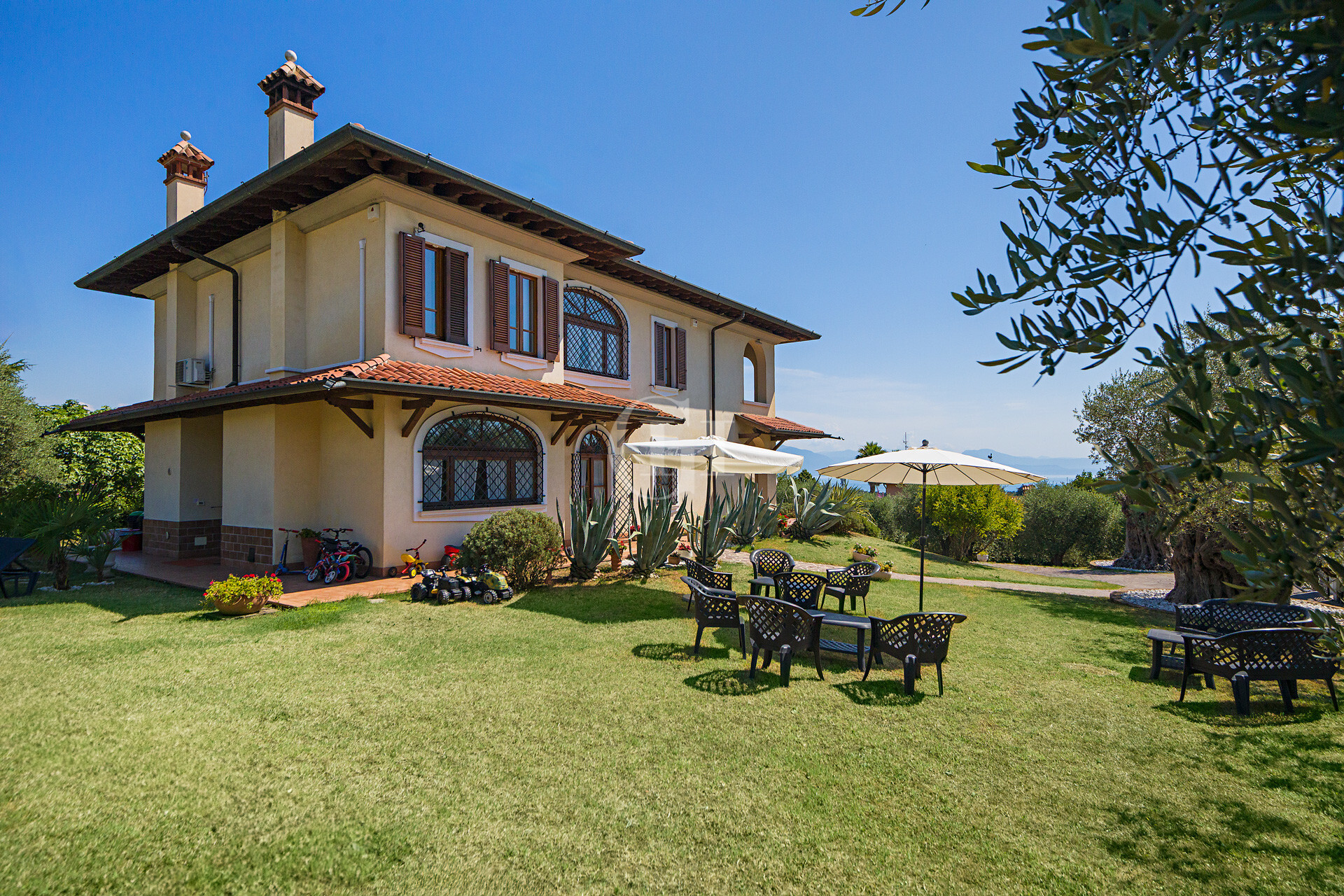 The property is immersed in a large private garden, finely planted and cared for in every detail, with the possibility of building a panoramic lakefront swimming pool. The driveway entrance opens onto a scenic driveway framed by century-old olive trees, flowering bushes…