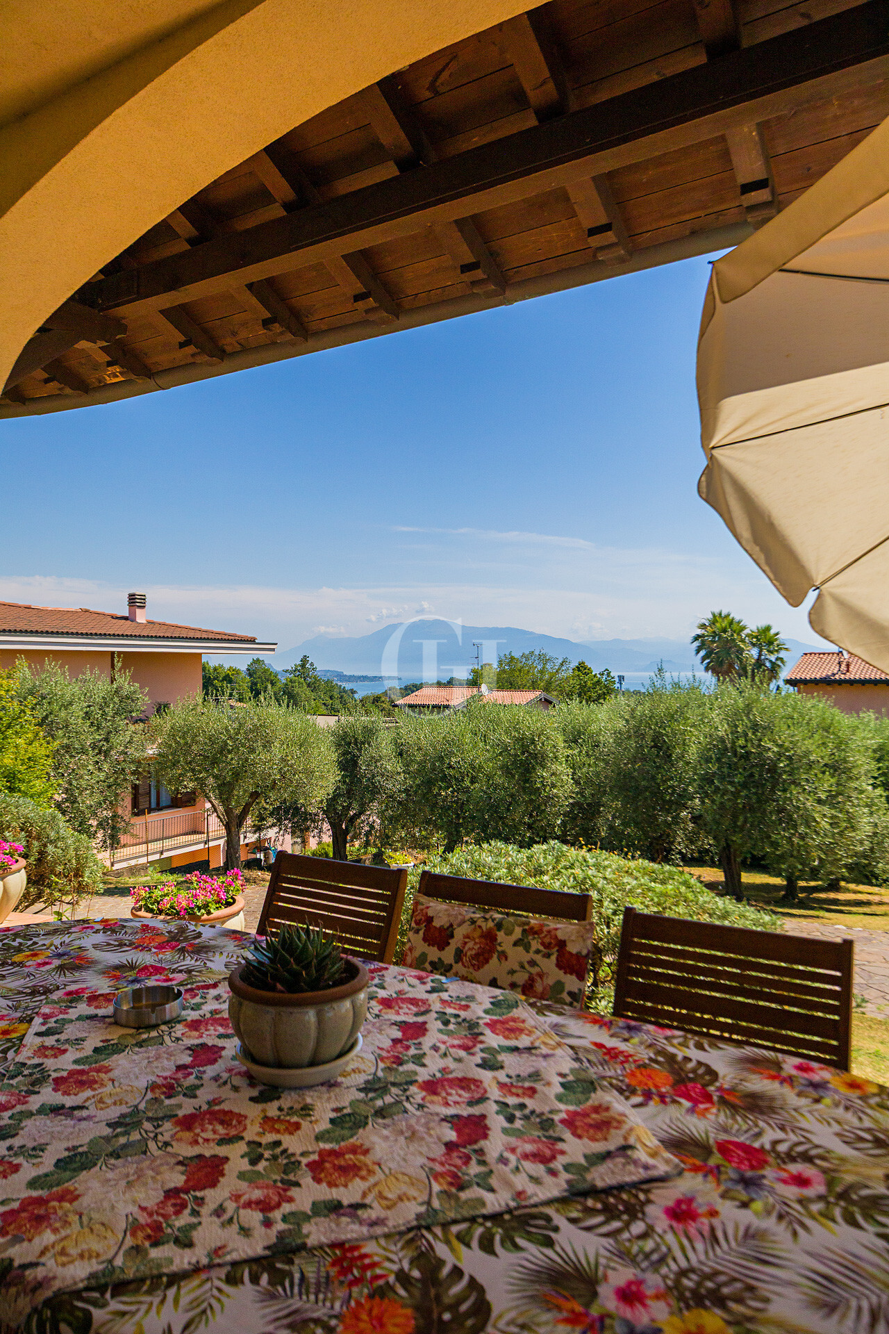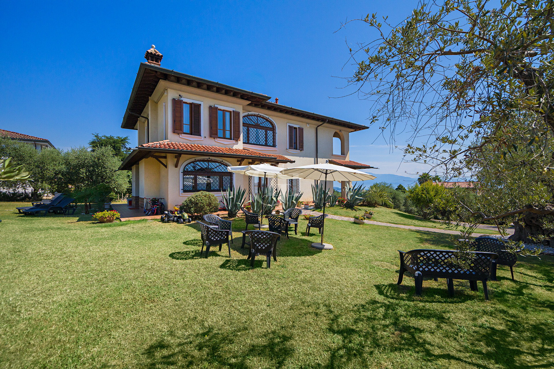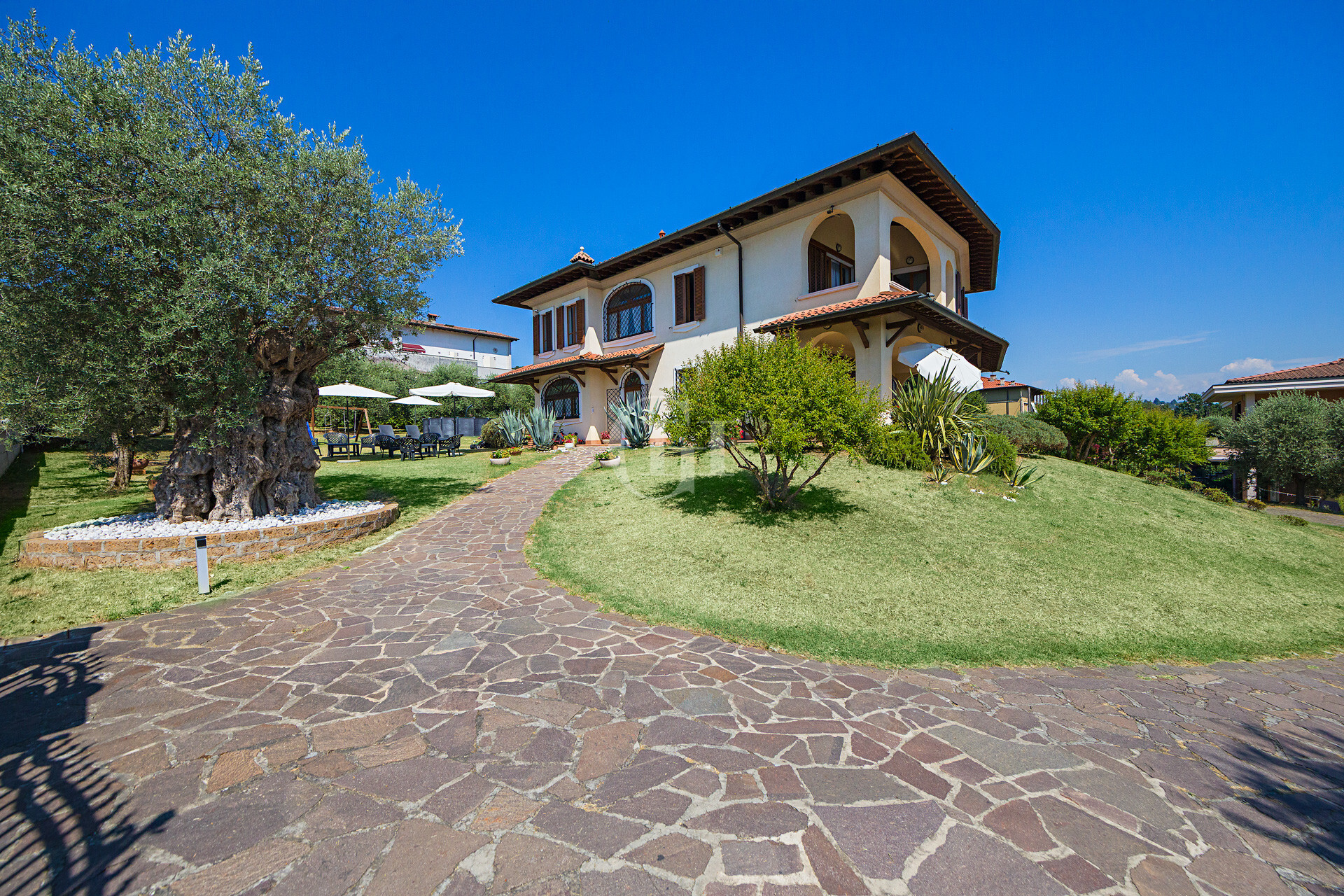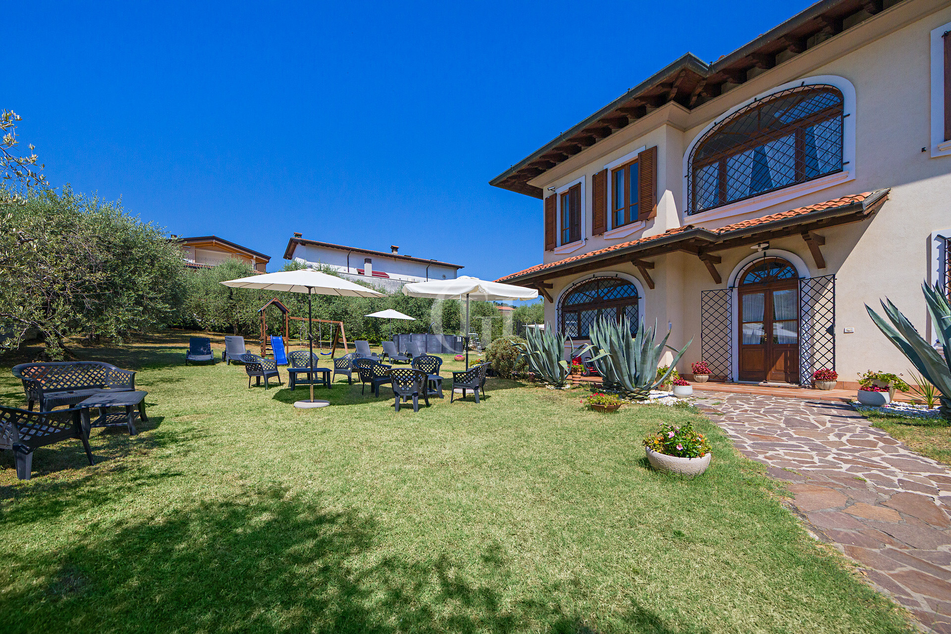 The property is immersed in a large private garden, finely planted and cared for in every detail, with the possibility of building a panoramic lakefront swimming pool. The driveway entrance opens onto a scenic driveway framed by century-old olive trees, flowering bushes…
