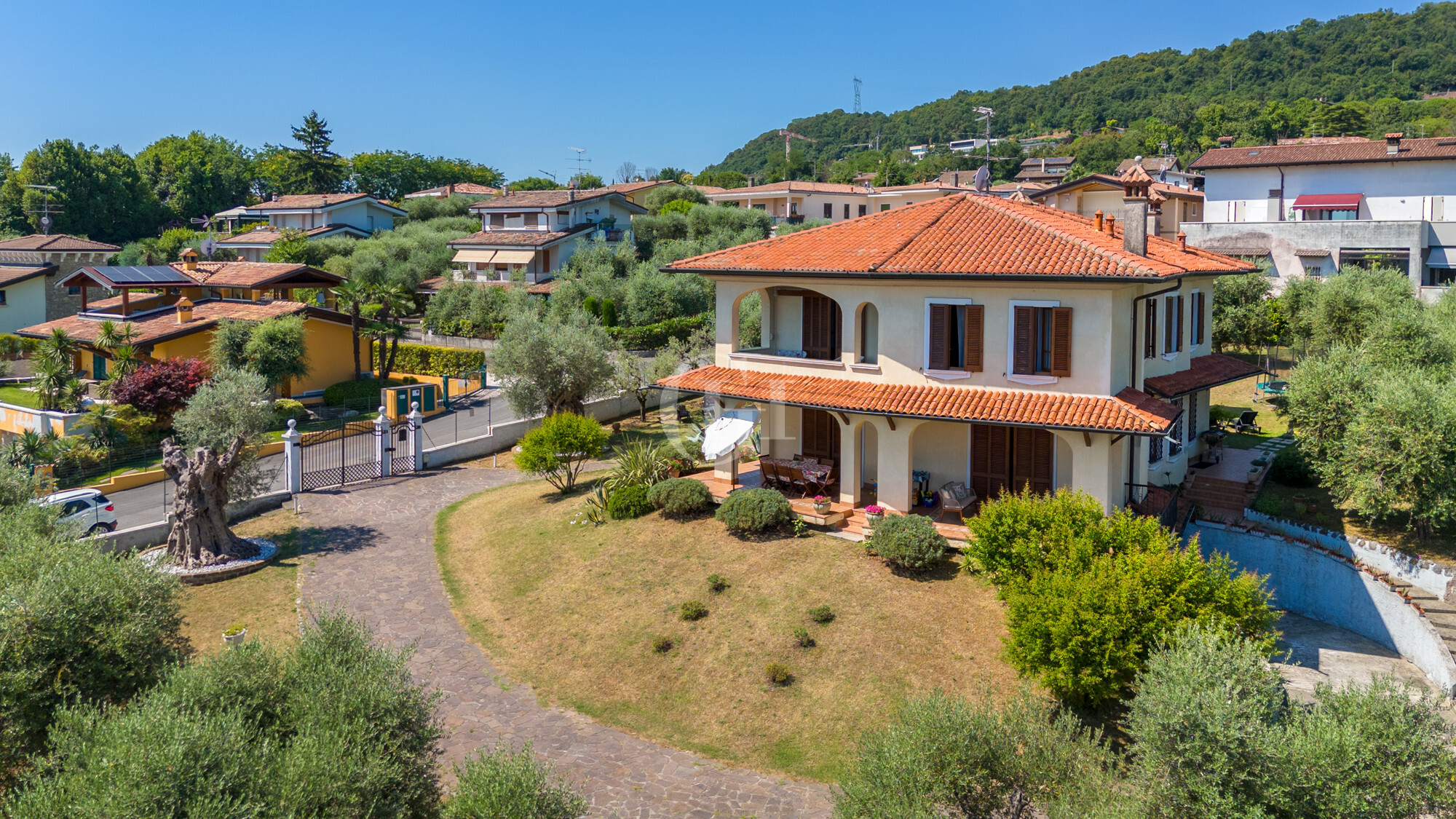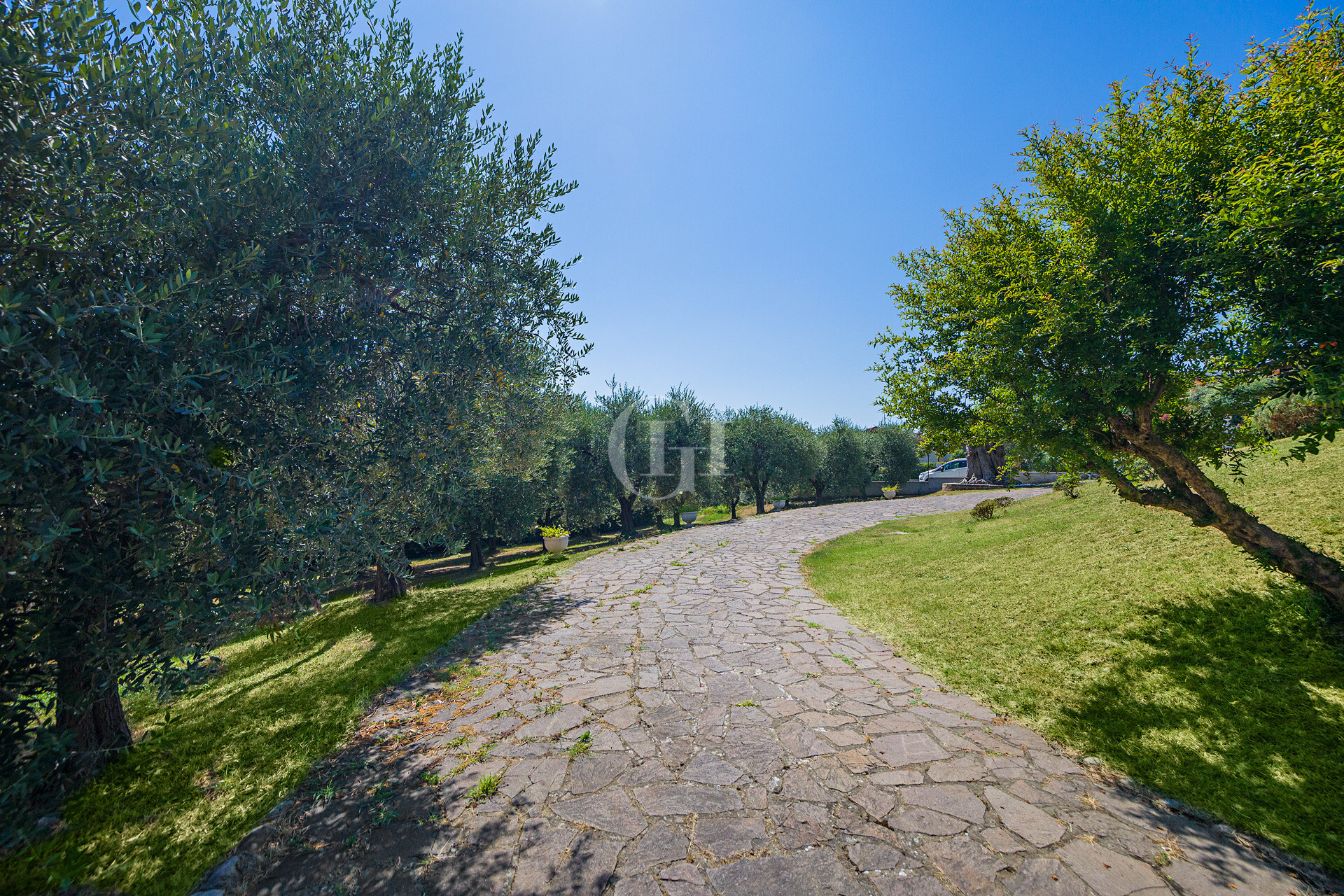 The property is immersed in a large private garden, finely planted and cared for in every detail, with the possibility of building a panoramic lakefront swimming pool. The driveway entrance opens onto a scenic driveway framed by century-old olive trees, flowering bushes and ornamental essences, creating an elegant and natural atmosphere from the first glance.