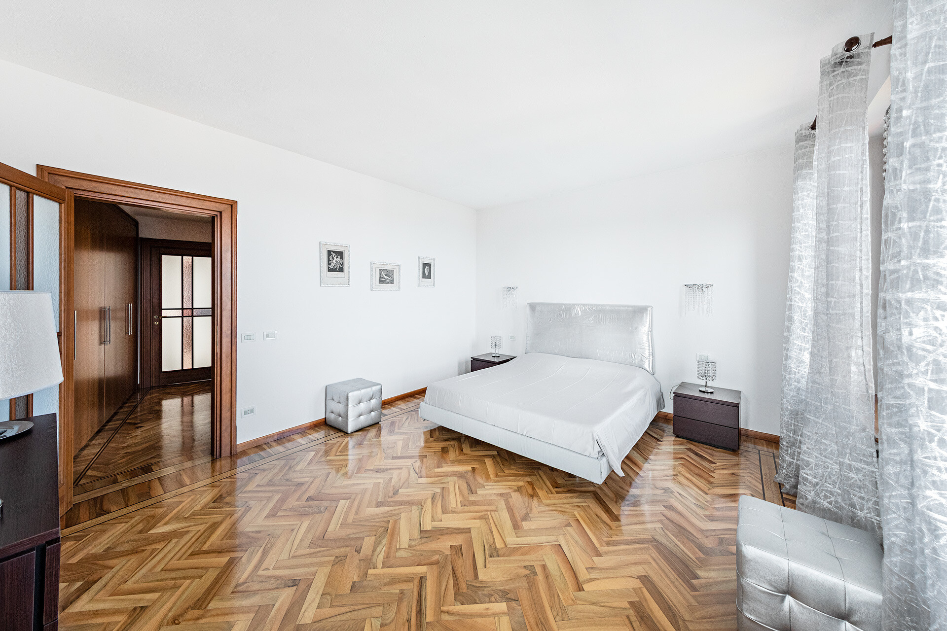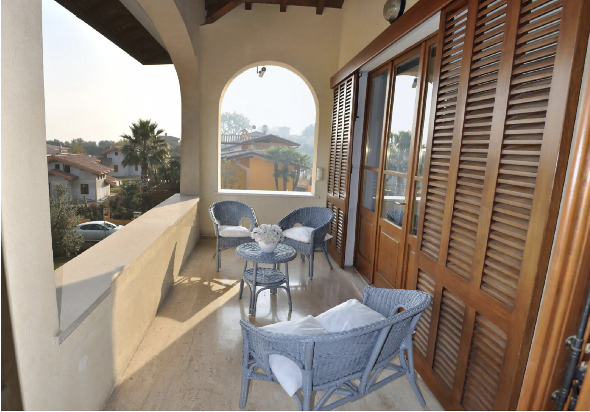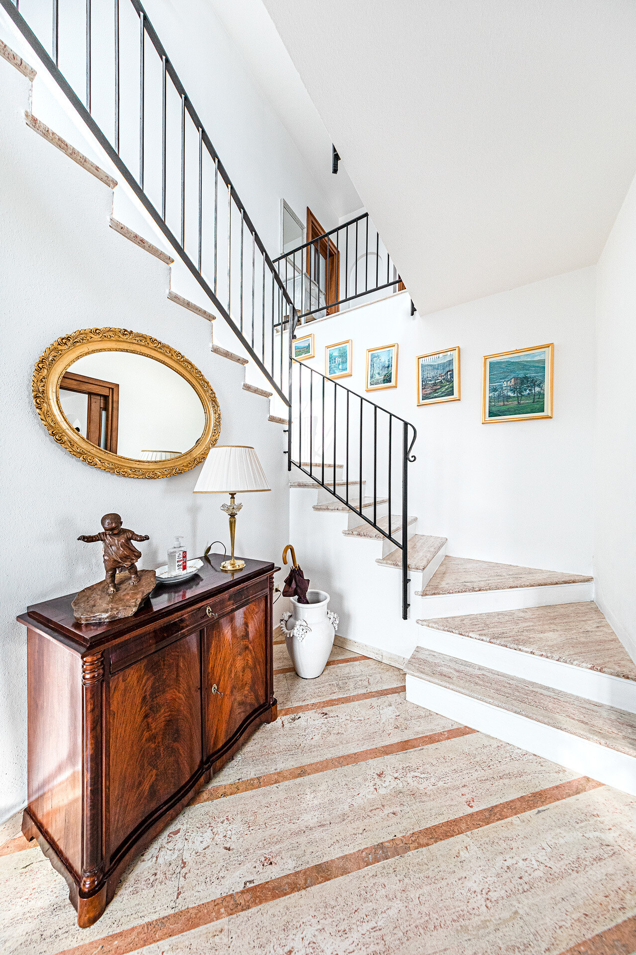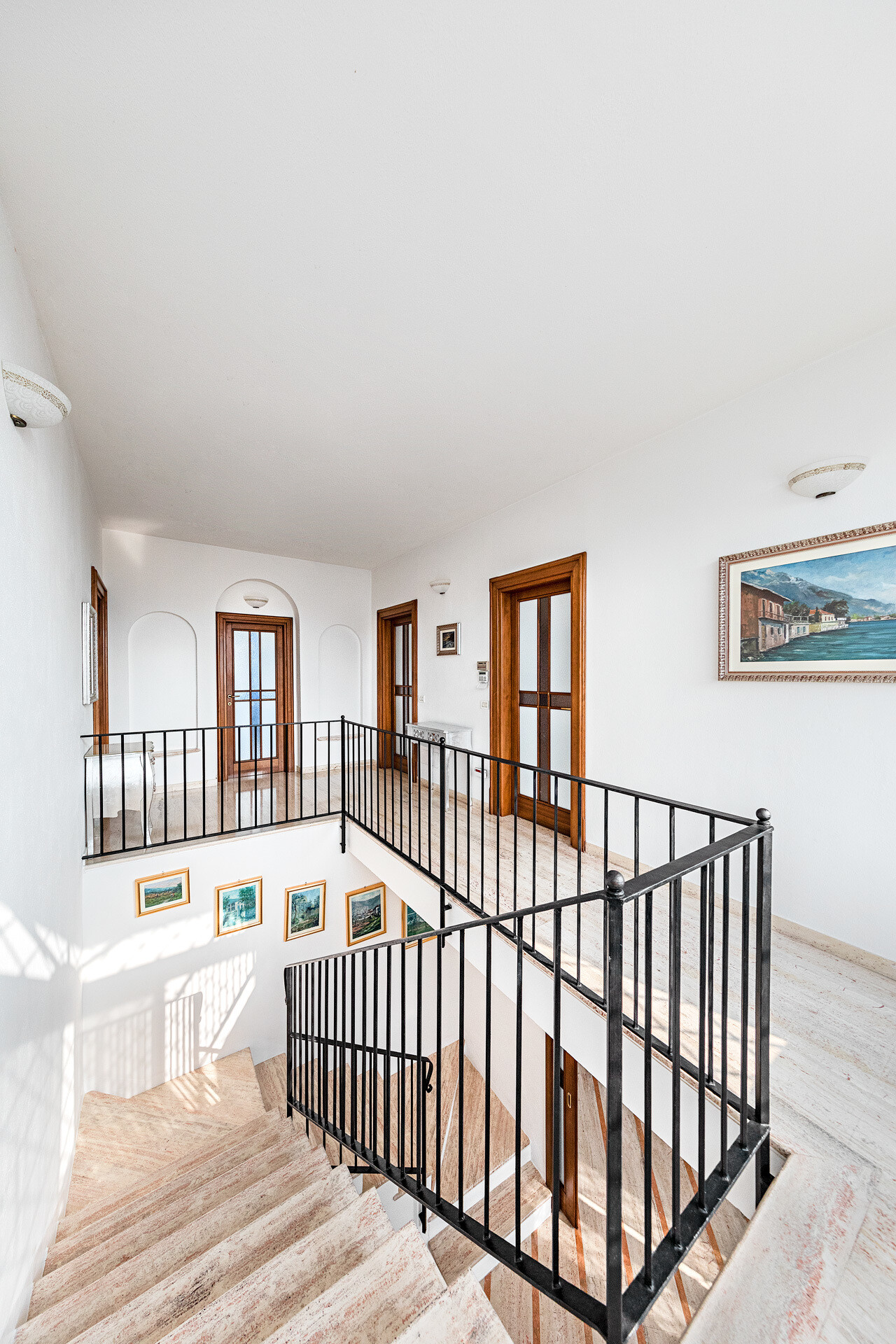 An important staircase, with a classic and refined design, leads to the upper floor dedicated to the sleeping area. Here there are four double bedrooms, all of generous size, and three well-finished bathrooms. The highlight is undoubtedly the covered loggia with breathtaking views of the lake, a corner of absolute peace where you can enjoy every sunset in total privacy.