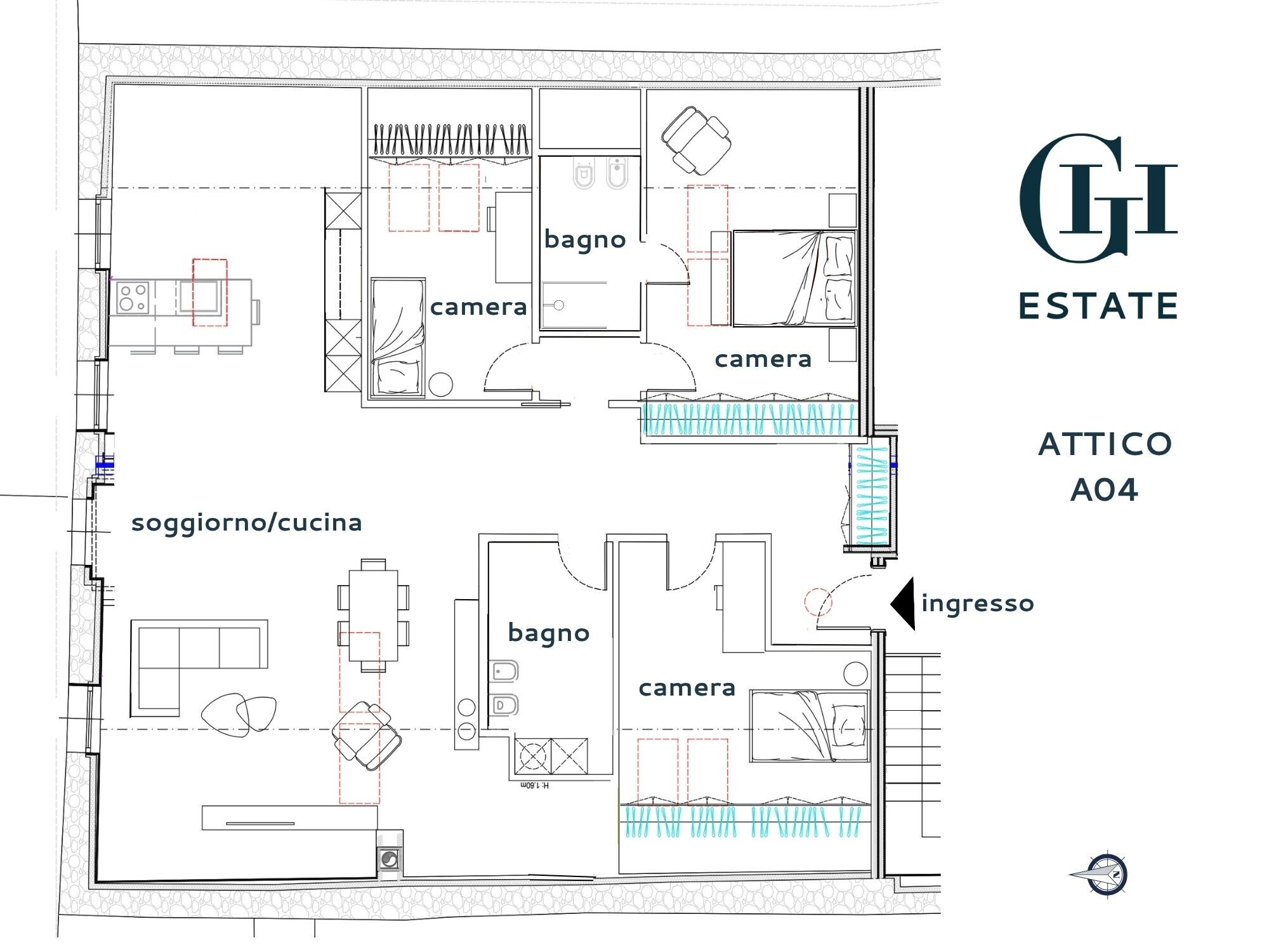 La zona giorno si apre su una superficie ariosa e ben distribuita, pensata per il comfort quotidiano e la convivialità. La zona notte comprende tre camere da letto ben proporzionate, tra cui una matrimoniale con bagno privato. Un secondo bagno finestrato completa la distribuzione interna.