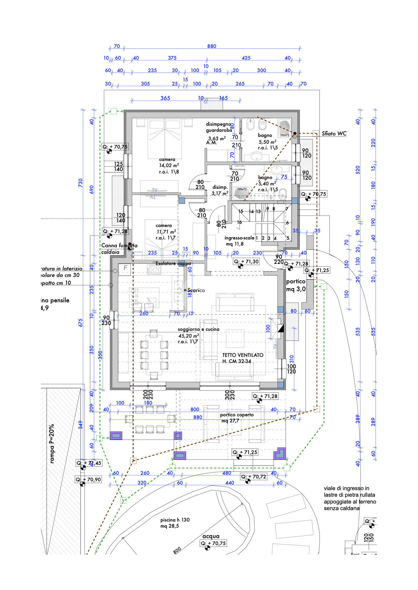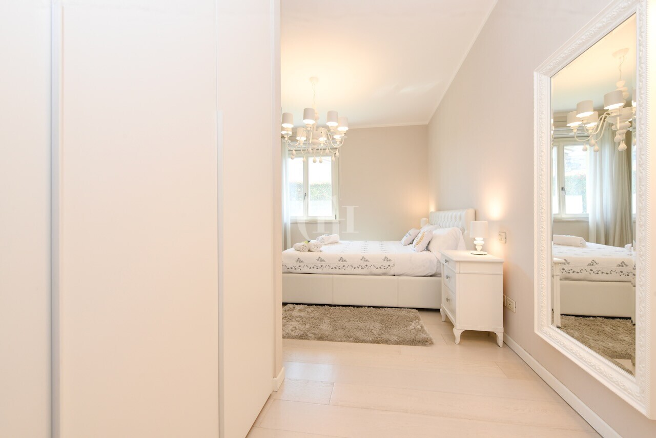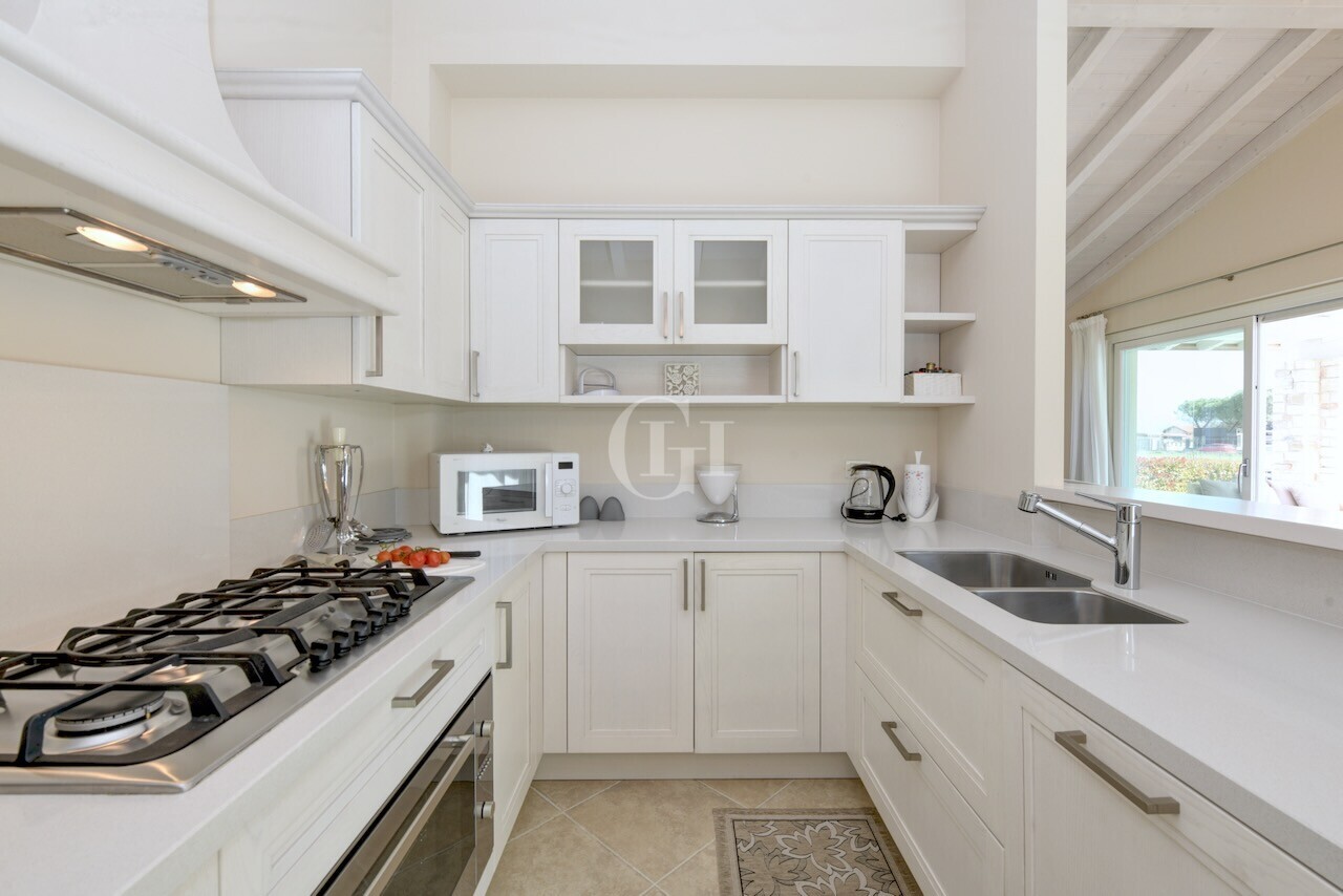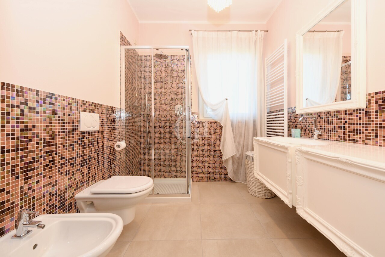 La zona giorno è un grande open space inondato di luce, dove le travi del tetto, sbiancate per esaltare la luminosità, scaldano l’ambiente con eleganza. I soffitti molto alti amplificano la sensazione di ampiezza e le grandi vetrate mettono costantemente in dialogo l’interno con il giardino circostante, regalando luce naturale in ogni momento della giornata. La cucina, con piano cottura e forno da 90 cm, racconta la passione per la convivialità, mentre i porticati diventano il naturale prolungamento del living, pensati per vivere pranzi e serate all’aperto. La zona notte, elegante e funzionale, comprende tre ampie camere matrimoniali. Al piano terra si trovano due camere: la prima, pensata come master room, è arricchita da una cabina armadio e da un elegante bagno privato; la seconda, anch’essa di generose dimensioni, attualmente ospita due letti singoli, perfetta per ospitare i più piccoli. Salendo in una caratteristica torretta, troviamo una camera suggestiva e riservata con bagno privato e accesso ad un grazioso terrazzino.