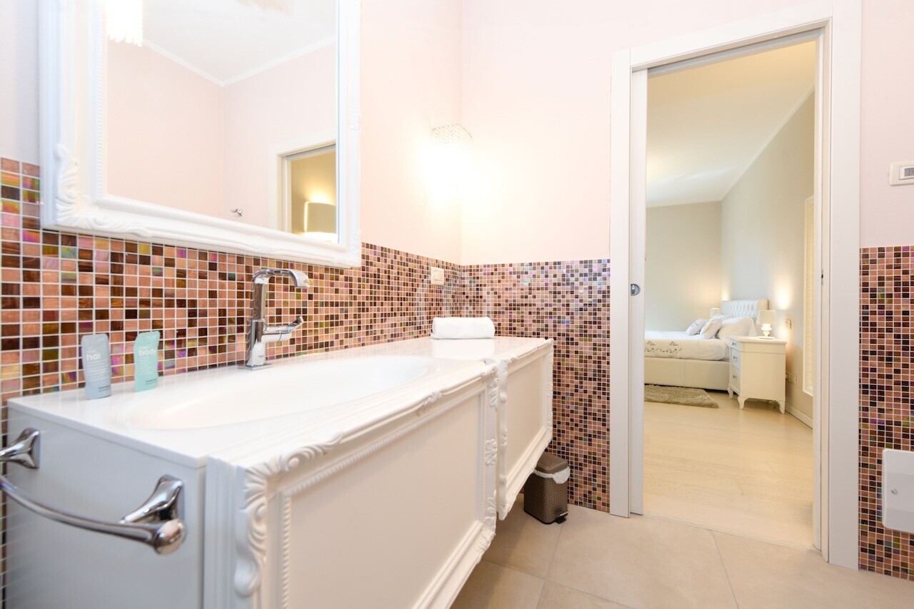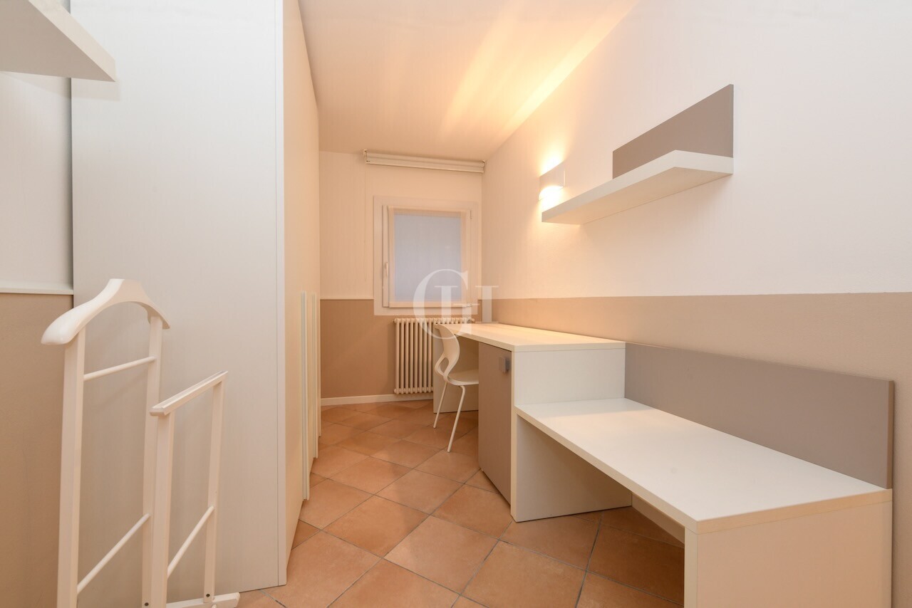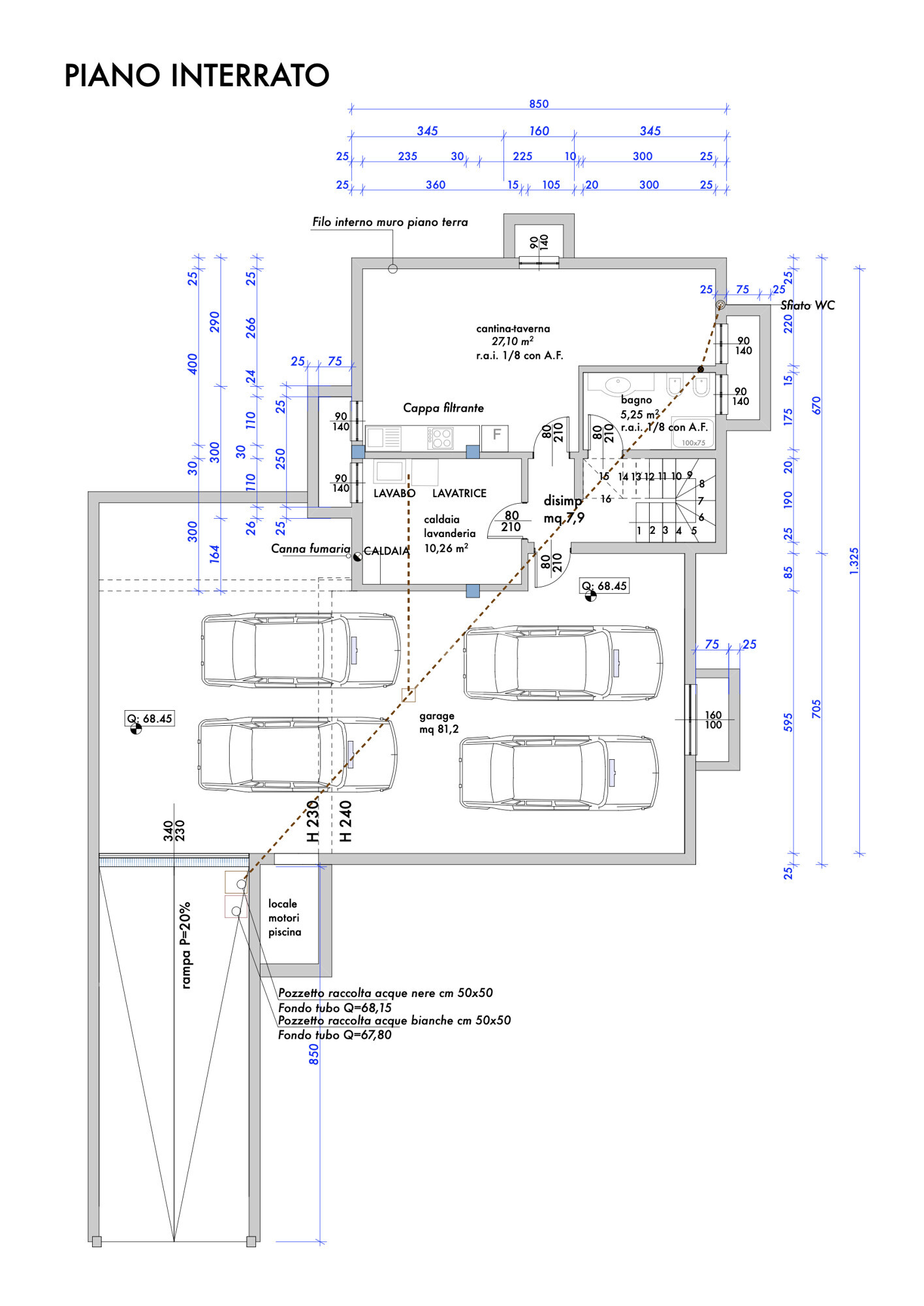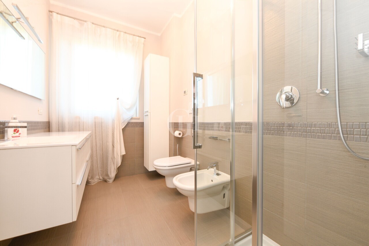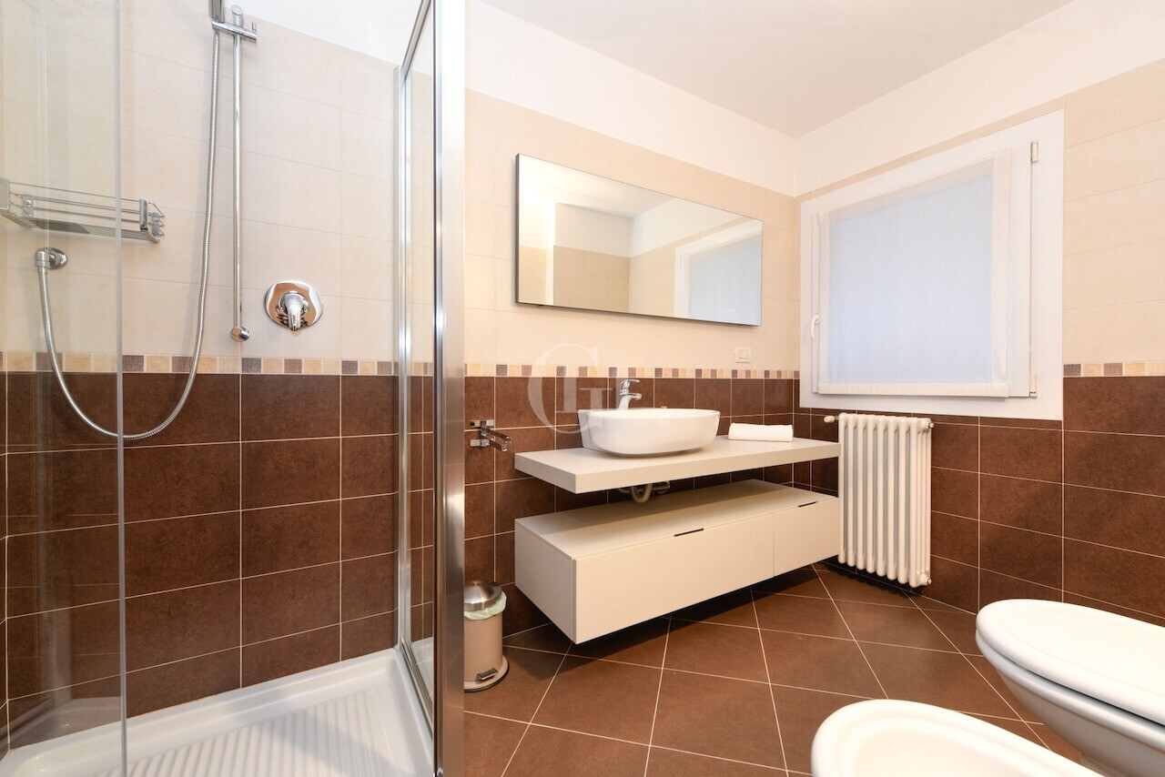 Scendendo al piano interrato si scopre un ambiente che amplia notevolmente le potenzialità della villa. Qui trova spazio una grande stanza oggi adibita come ulteriore camera da letto con zona studio, affiancata da un bagno completo con doccia e da un’ampia lavanderia. Sullo stesso livello troviamo poi il box auto piastrellato di generose dimensioni, capace di ospitare comodamente più autovetture, moto e biciclette, servito da una rampa dolce pensata per facilitare l’accesso anche alle auto più sportive.